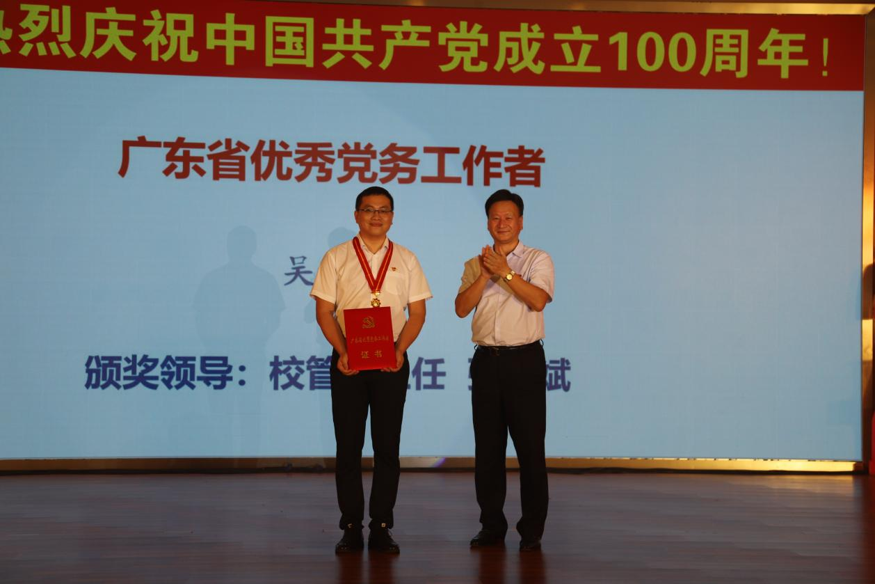 张亚斌为广东省优秀党务工作者吴辉军颁奖
