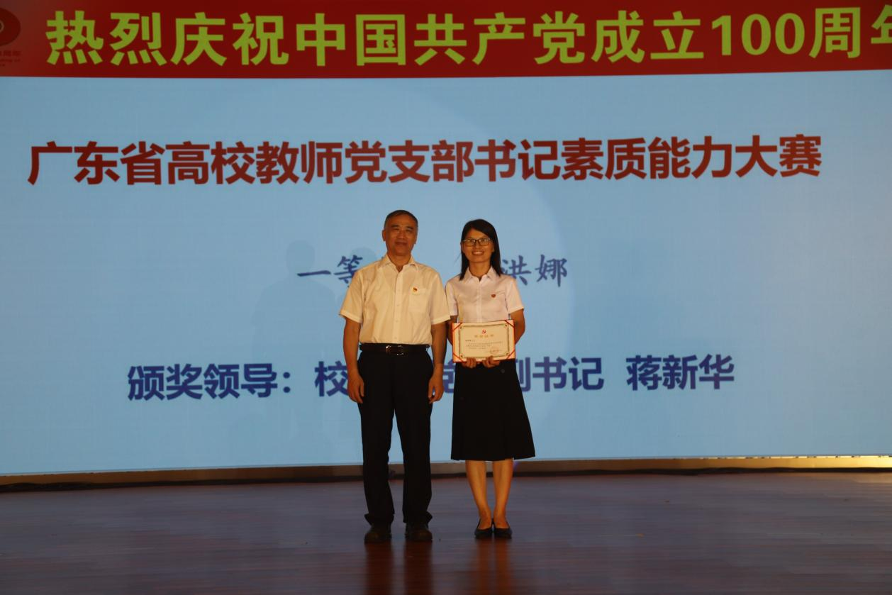 蒋新华为广东省高校教师党支部素质能力大赛一等奖获奖者戚洪娜颁奖