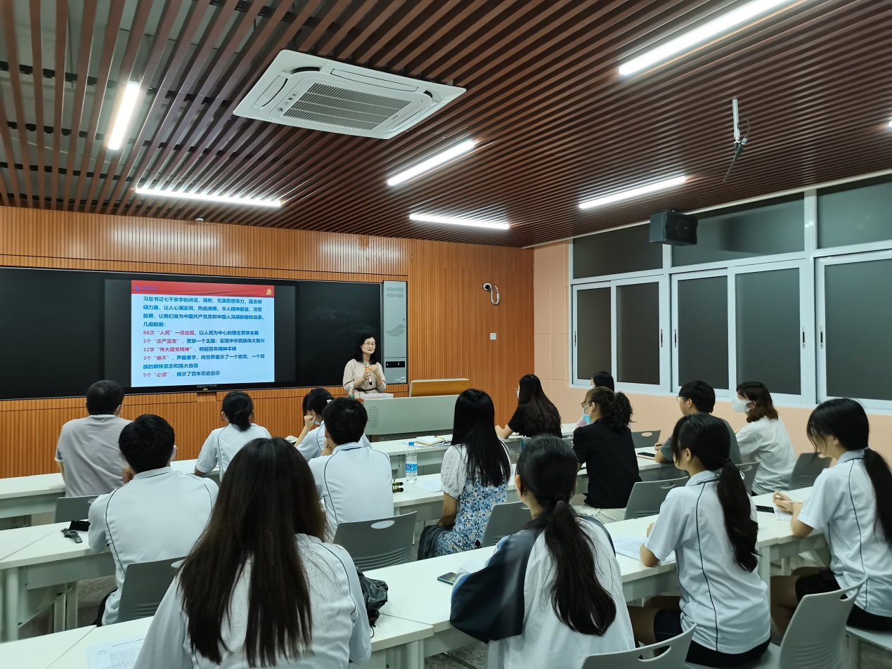 “讲”。黄学茭讲到,习近平总书记7000余字的重要讲话,充满思想伟力,蕴含磅礴力量。她重点讲了86次“人民”一词出现所彰显的以人民为中心的理念;5个“庄严宣告”;32个字的“伟大建党精神”;3个“绝不”;9个“必须”。黄学茭强调,学习习近平总书记的重要讲话,要从中不断汲取信仰的力量、思想的力量、奋进的力量,进一步坚定对马克思主义,对中国特色社会主义的信念,对实现中华民族伟大复兴的中国梦的信心,并转化为学习、工作的动力,为实现中华民族伟大复兴的中国梦而接续奋斗!