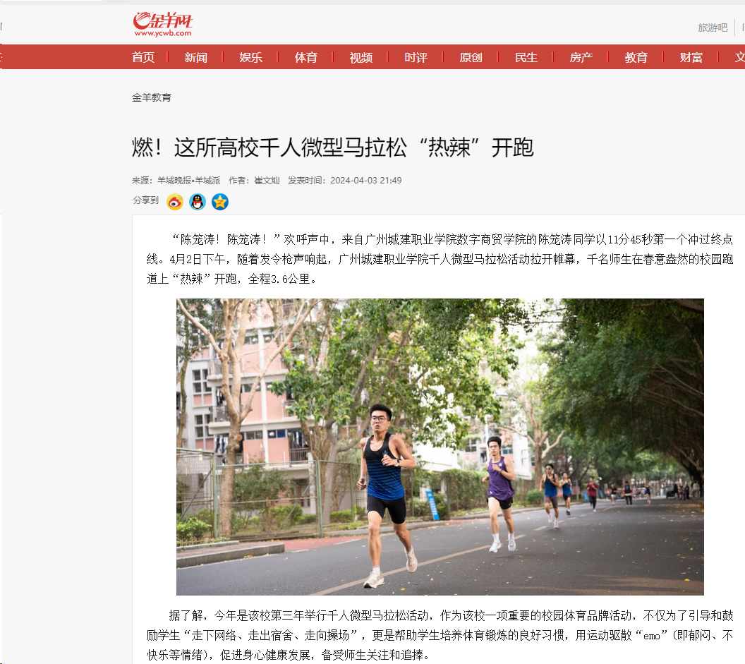 “长跑是一种提升自身身体素质的良好方式,我们将以阳光体育运动作为以体育人的重要载体,让运动不仅仅是一项赛事,更成为同学们的生活方式。”该校体育与健康学院负责人介绍,一直以来,学校体育工作紧跟体育强国建设的步伐,多措并举增强学生体能素质,探索体教融合的“城建路径”,有效营造重视体育、积极锻炼、追求健康的校园新风尚。