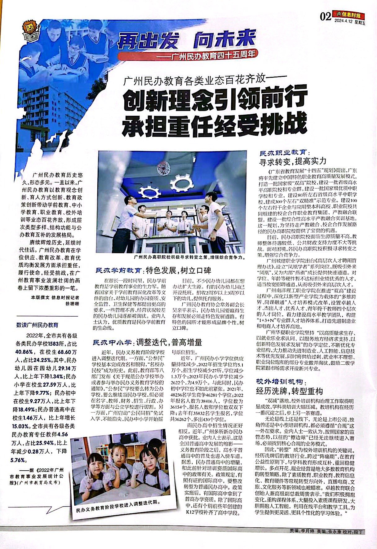 广州民办教育历史悠久,形态多元。一直以来,广州民办教育以教育观念创新、育人方式创新、教育政策创新带动学前教育、中小学教育、职业教育、校外培训等业态百花齐放,形成层次类型多样、结构功能与公办教育互补的发展格局。