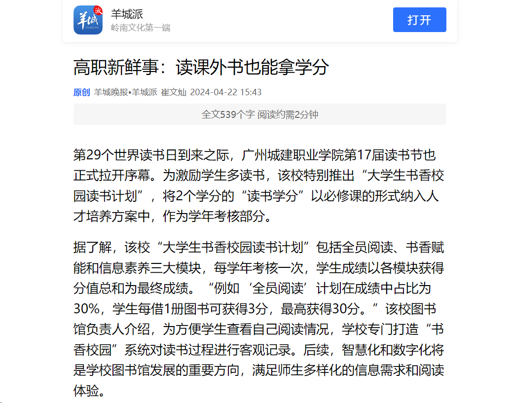 第29个世界读书日到来之际,广州城建职业学院第17届读书节也正式拉开序幕。为激励学生多读书,该校特别推出“大学生书香校园读书计划”,将2个学分的“读书学分”以必修课的形式纳入人才培养方案中,作为学年考核部分。