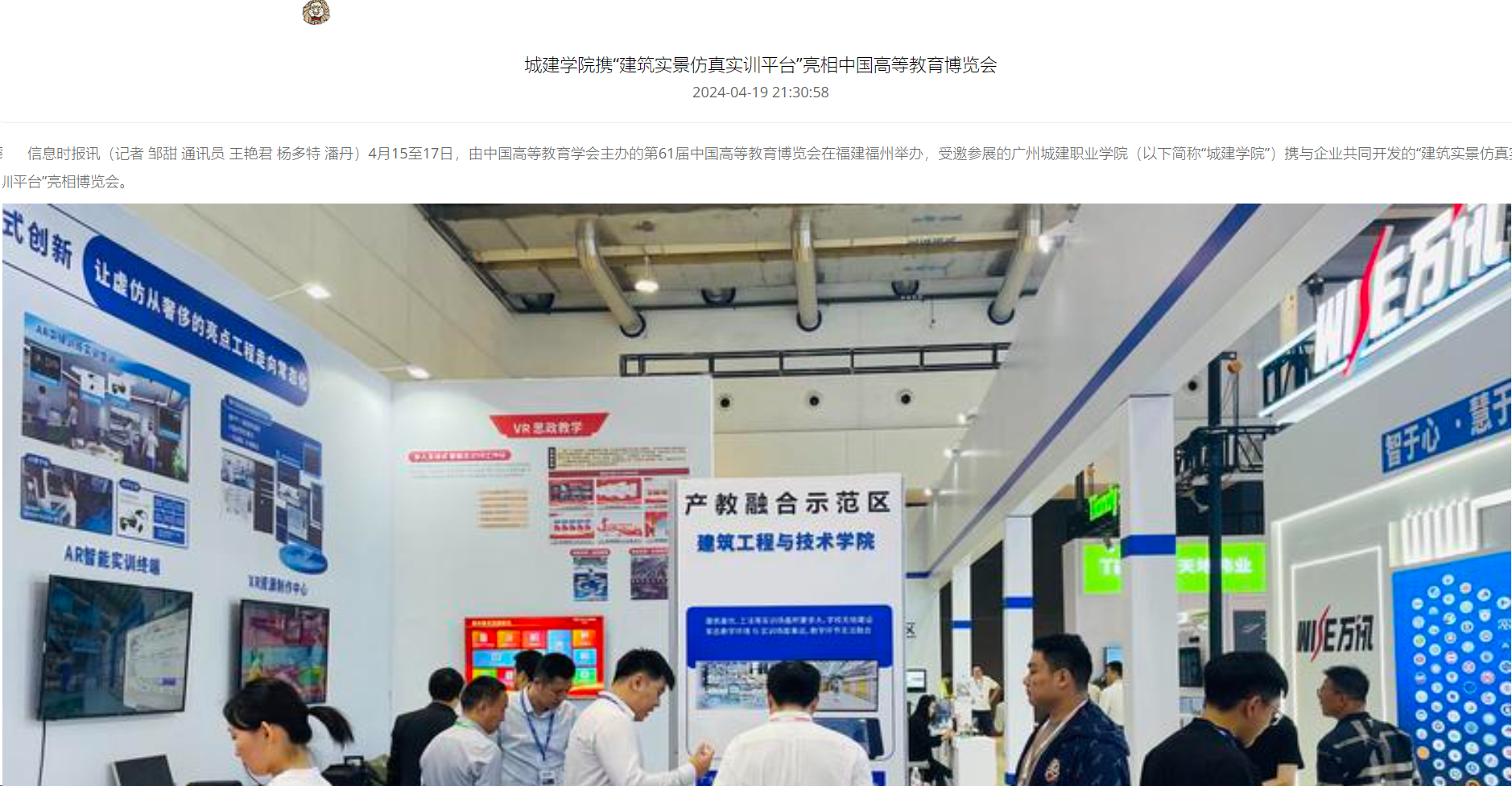 4月15至17日,由中国高等教育学会主办的第61届中国高等教育博览会在福建福州举办,受邀参展的广州城建职业学院(以下简称“yL23411永利官网登录”)携与企业共同开发的“建筑实景仿真实训平台”亮相博览会。