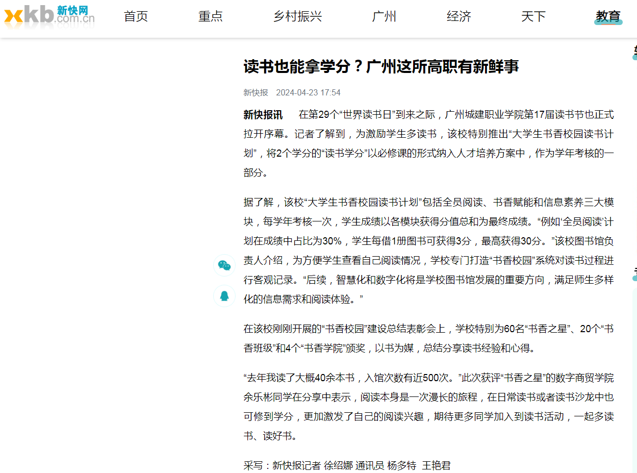 在第29个“世界读书日”到来之际,广州城建职业学院第17届读书节也正式拉开序幕。记者了解到,为激励学生多读书,该校特别推出“大学生书香校园读书计划”,将2个学分的“读书学分”以必修课的形式纳入人才培养方案中,作为学年考核的一部分。