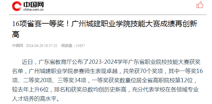 近日,广东省教育厅公布了2023-2024学年广东省职业院校技能大赛获奖名单,广州城建职业学院参赛师生表现卓越,共荣获70个奖项,其中一等奖16项、二等奖20项、三等奖34项,一等奖获奖数量位居全省高职院校第12位,较去年上升6位,排名和获奖总数均创历史新高,充分代表学校在各领域专业人才培养的高水平。
