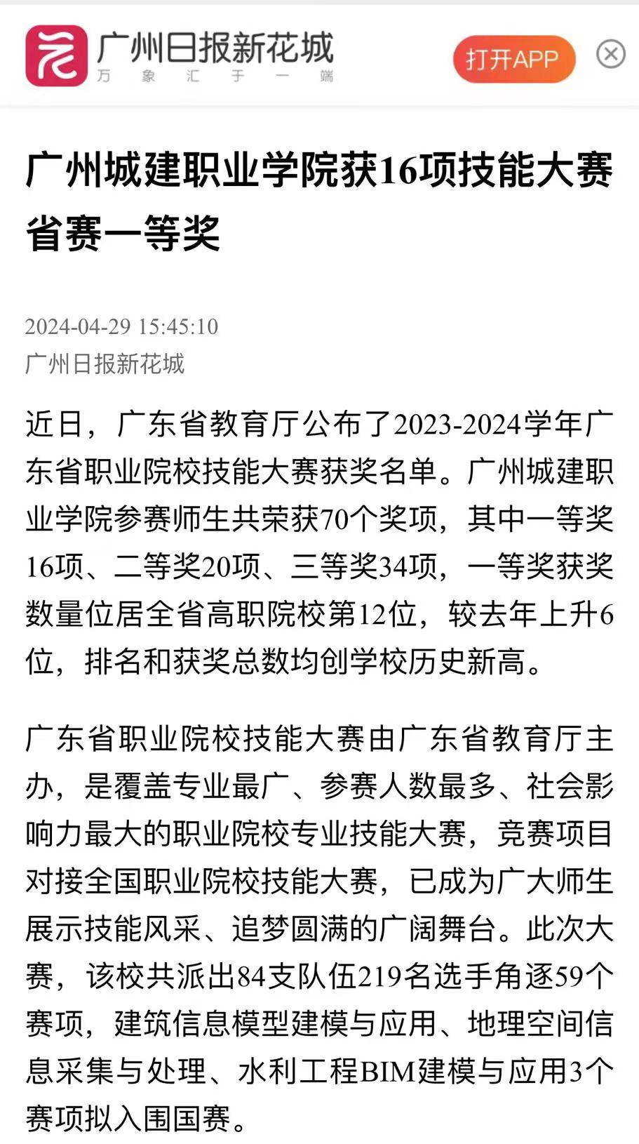 近日,广东省教育厅公布了2023-2024学年广东省职业院校技能大赛获奖名单。广州城建职业学院参赛师生共荣获70个奖项,其中一等奖16项、二等奖20项、三等奖34项,一等奖获奖数量位居全省高职院校第12位,较去年上升6位,排名和获奖总数均创学校历史新高。