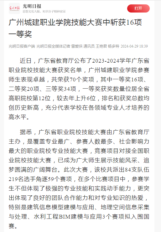 据悉,广东省职业院校技能大赛由广东省教育厅主办,是覆盖专业最广、参赛人数最多、社会影响力最大的职业院校专业技能大赛,竞赛项目对接全国职业院校技能大赛,已成为广大师生展示技能风采、追梦圆满的广阔舞台。此次大赛,该校共派出84支队伍219名选手角逐59个赛项,在多个比赛项目中,参赛学生不但体现了极强的专业技能和实践动手能力,更突出体现了良好的团队合作能力和对专业知识的热爱,特别是建筑信息模型建模与应用、地理空间信息采集与处理、水利工程BIM建模与应用3个赛项拟入围国赛。