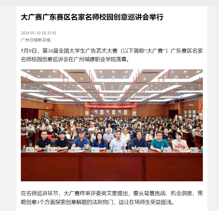 5月9日,第16届全国大学生广告艺术大赛(以下简称“大广赛”)广东赛区名家名师校园创意巡讲会在广州城建职业学院落幕。