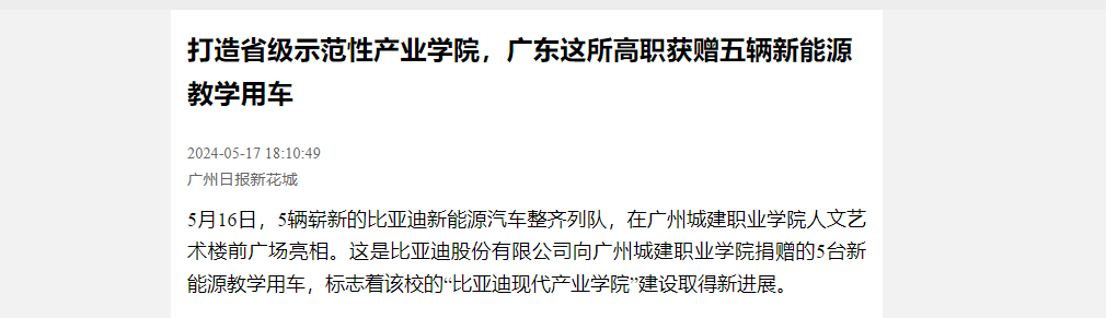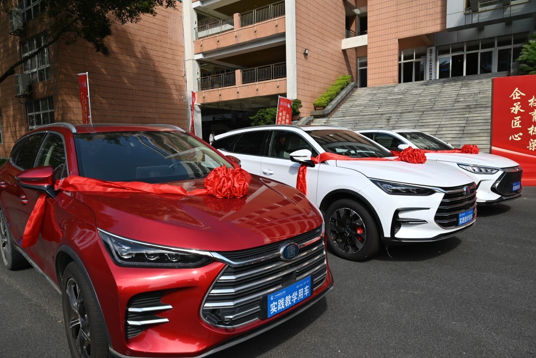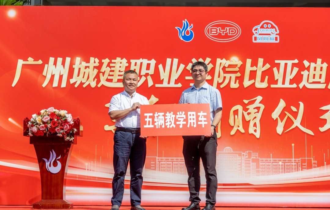 5月16日,5辆崭新的比亚迪新能源汽车整齐列队,在广州城建职业学院人文艺术楼前广场亮相。这是比亚迪股份有限公司向广州城建职业学院捐赠的5台新能源教学用车,标志着该校的“比亚迪现代产业学院”建设取得新进展。