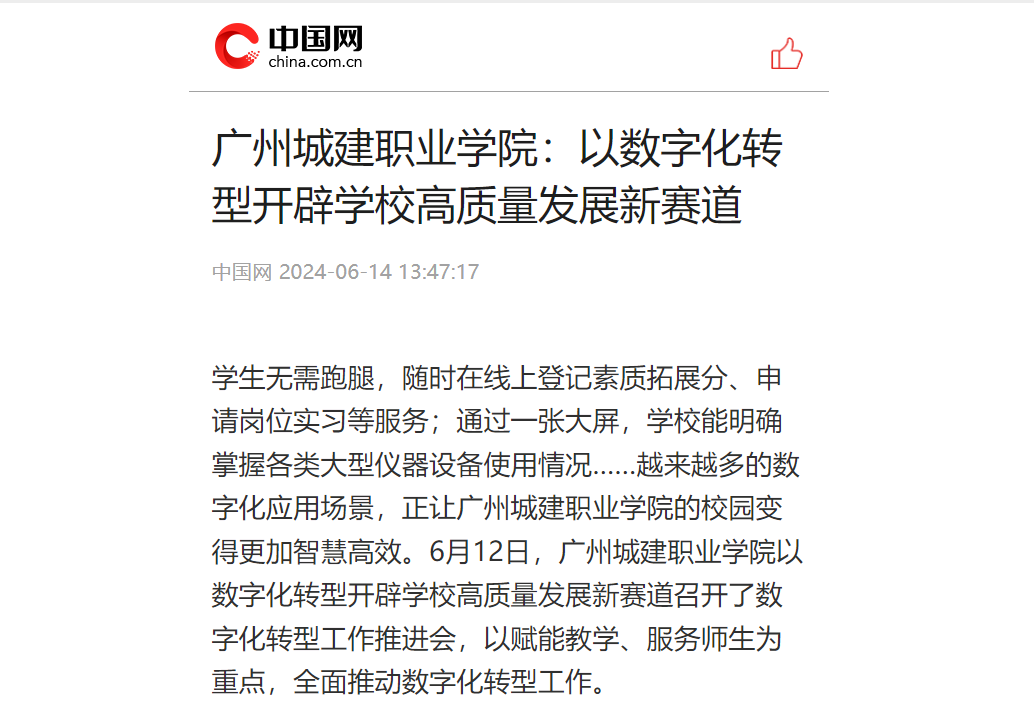 学生无需跑腿,随时在线上登记素质拓展分、申请岗位实习等服务;通过一张大屏,学校能明确掌握各类大型仪器设备使用情况……越来越多的数字化应用场景,正让广州城建职业学院的校园变得更加智慧高效。6月12日,广州城建职业学院以数字化转型开辟学校高质量发展新赛道召开了数字化转型工作推进会,以赋能教学、服务师生为重点,全面推动数字化转型工作。