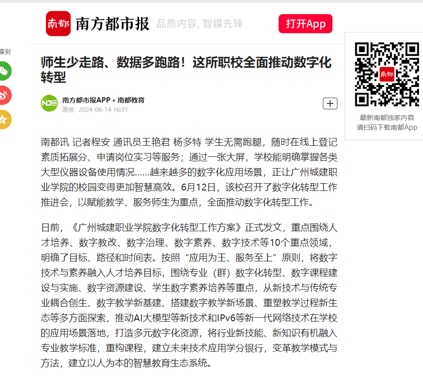 学生无需跑腿,随时在线上登记素质拓展分、申请岗位实习等服务;通过一张大屏,学校能明确掌握各类大型仪器设备使用情况……越来越多的数字化应用场景,正让广州城建职业学院的校园变得更加智慧高效。6月12日,该校召开了数字化转型工作推进会,以赋能教学、服务师生为重点,全面推动数字化转型工作。