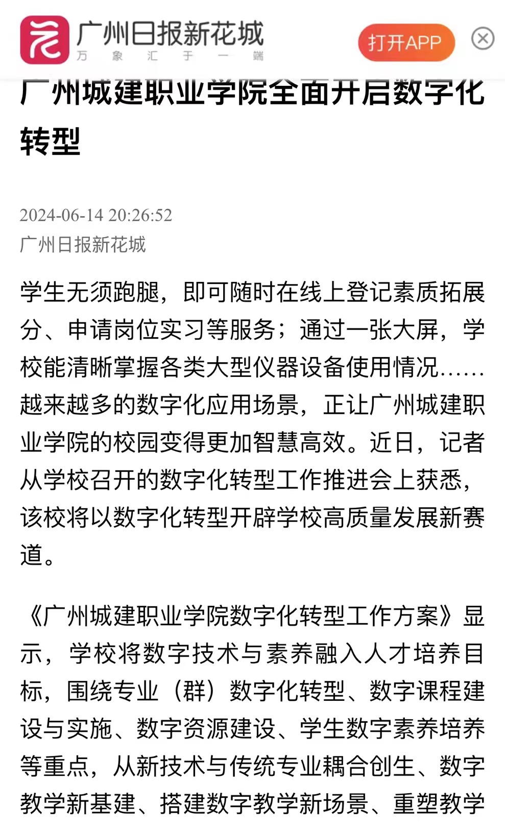 《广州城建职业学院数字化转型工作方案》显示,学校将数字技术与素养融入人才培养目标,围绕专业(群)数字化转型、数字课程建设与实施、数字资源建设、学生数字素养培养等重点,从新技术与传统专业耦合创生、数字教学新基建、搭建数字教学新场景、重塑教学过程新生态等多方面积极探索,推动AI大模型等新技术和IPv6等新一代网络技术在学校的应用场景落地。
