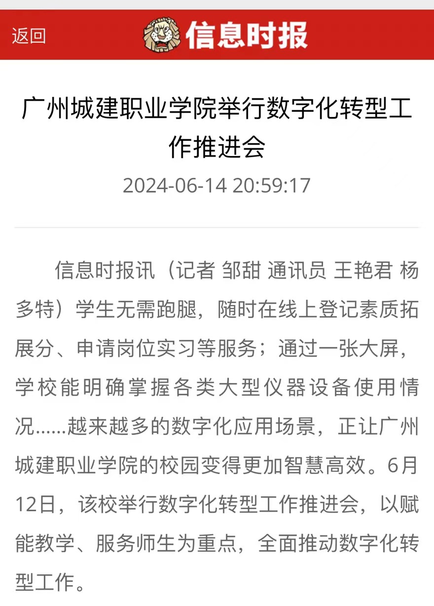 学生无需跑腿,随时在线上登记素质拓展分、申请岗位实习等服务;通过一张大屏,学校能明确掌握各类大型仪器设备使用情况……越来越多的数字化应用场景,正让广州城建职业学院的校园变得更加智慧高效。6月12日,该校举行数字化转型工作推进会,以赋能教学、服务师生为重点,全面推动数字化转型工作。
