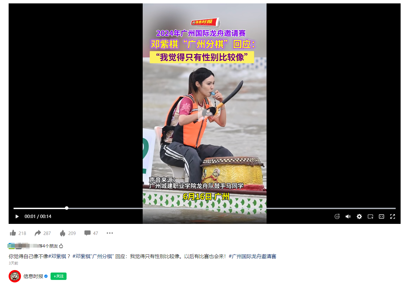你觉得自己像不像#邓紫棋?#邓紫棋“广州分棋”回应:我觉得只有性别比较像。以后有比赛也会来!#广州国际龙舟邀请赛