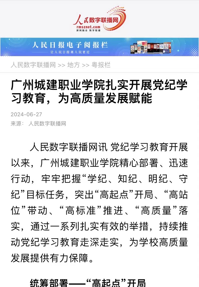 党纪学习教育开展以来,广州城建职业学院精心部署、迅速行动,牢牢把握“学纪、知纪、明纪、守纪”目标任务,突出“高起点”开局、“高站位”带动、“高标准”推进、“高质量”落实,通过一系列扎实有效的举措,持续推动党纪学习教育走深走实,为学校高质量发展提供有力保障。
