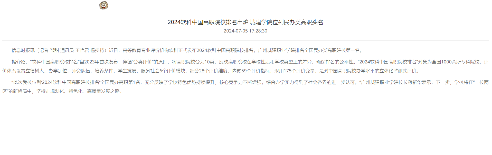 近日,高等教育专业评价机构软科正式发布2024软科中国高职院校排名,广州城建职业学院排名全国民办类高职院校第一名。