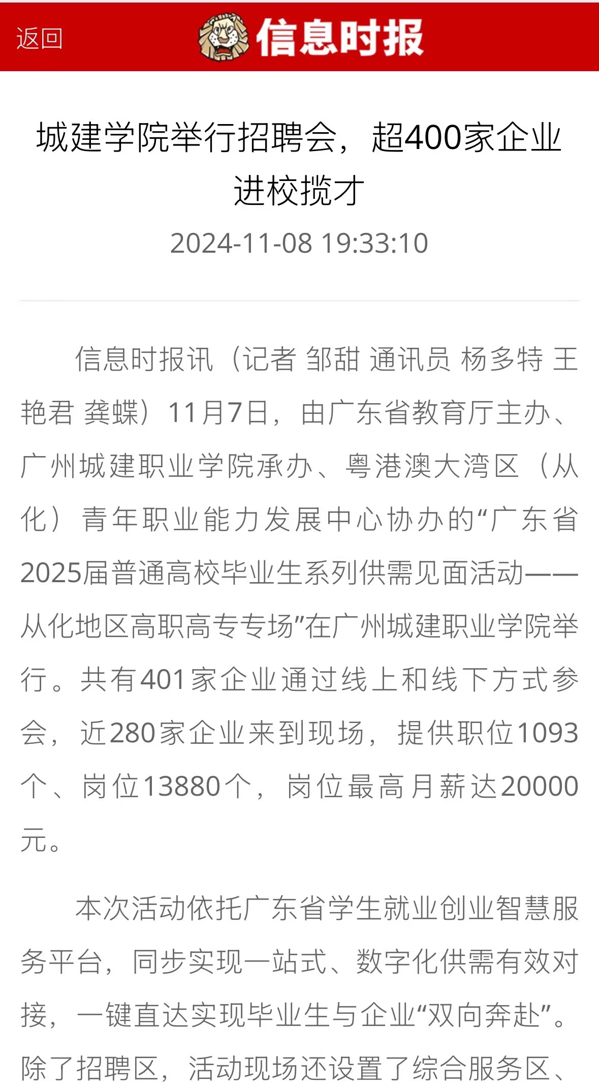 11月7日,由广东省教育厅主办、广州城建职业学院承办、粤港澳大湾区(从化)青年职业能力发展中心协办的“广东省2025届普通高校毕业生系列供需见面活动——从化地区高职高专专场”在广州城建职业学院举行。共有401家企业通过线上和线下方式参会,近280家企业来到现场,提供职位1093个、岗位13880个,岗位最高月薪达20000元。