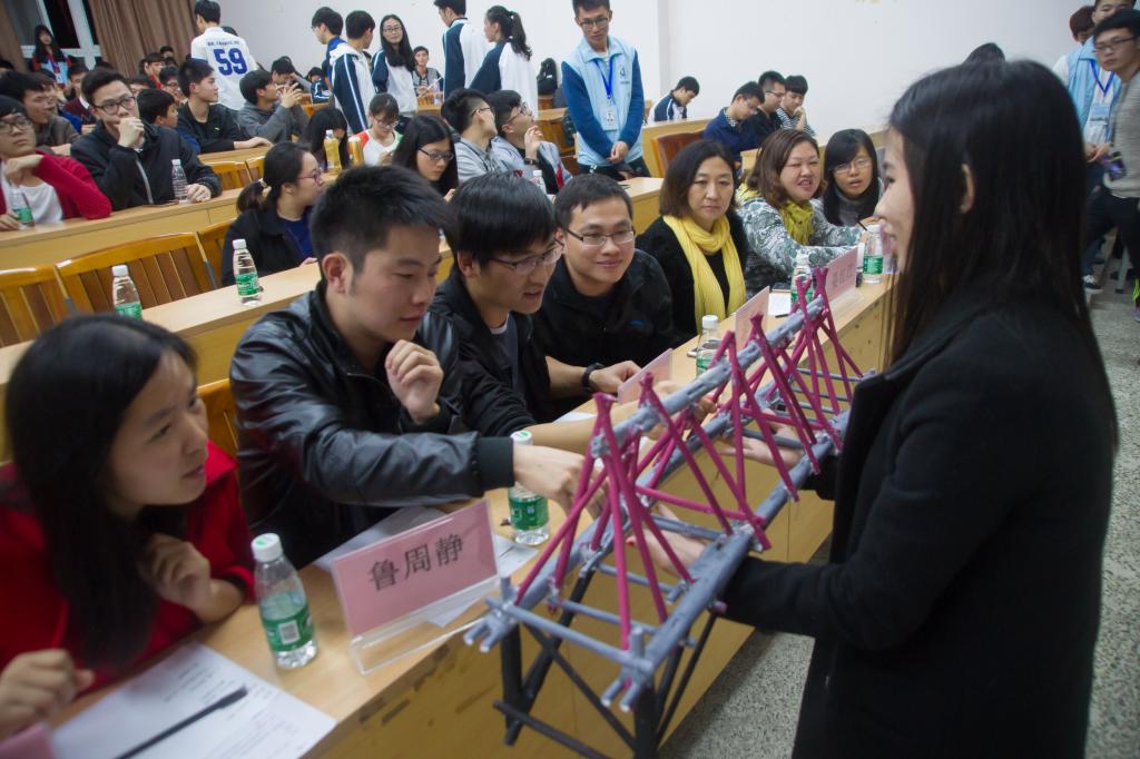 大赛以建筑结构和桥梁结构的承重能力为主题,分“纸塔承重”、“顶天立地”、“未来造桥家”三个环节,要求参赛队利用不同类型的材料,结合结构知识进行分析,充分发挥自身的创新、创造能力,设计出在结构理论上能分析合理,在现实生活中可存在实用的建筑物和构筑物模型。其中,“未来造桥家”的竞赛设置改沙体承载为砝码承载,较往年更进一步提升了竞赛的难度,但十组选手在现场勇于探索、迎难而上、斗智斗勇,使得作品的负重越来越大,赢得场内一阵阵认可的掌声。通过精彩激烈的角逐,最终14建工6班代表以其出色的构造及荷重摘夺本届大赛冠军。
