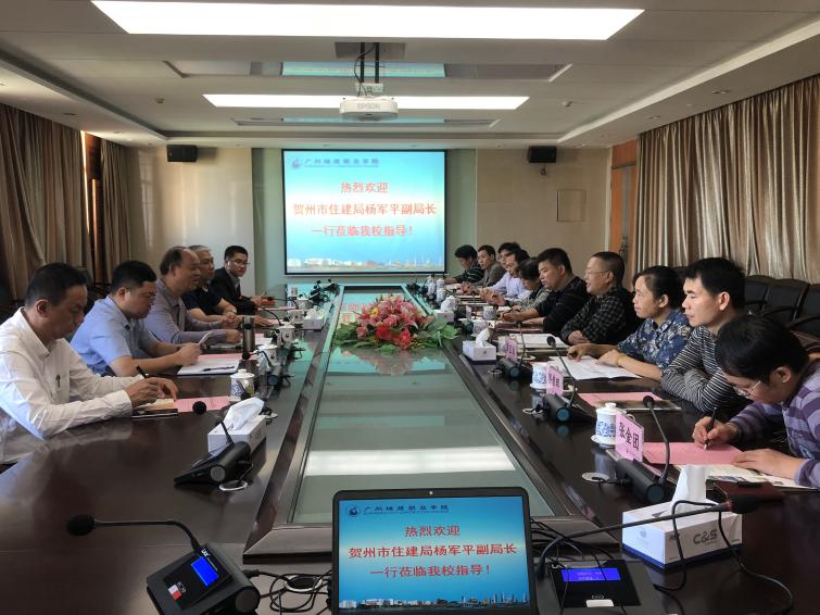 10月20日,广西贺州市住建局杨军平副局长率该局和桂林理工大学、贺州学院、贺州职业教育学院等一行10人莅临学校考察装配式建筑产业工人培训及现代建筑技术职业技能公共实训中心建设,进行座谈洽商合作办学。校长刘国生、公司副总经理于晓光等出席座谈。