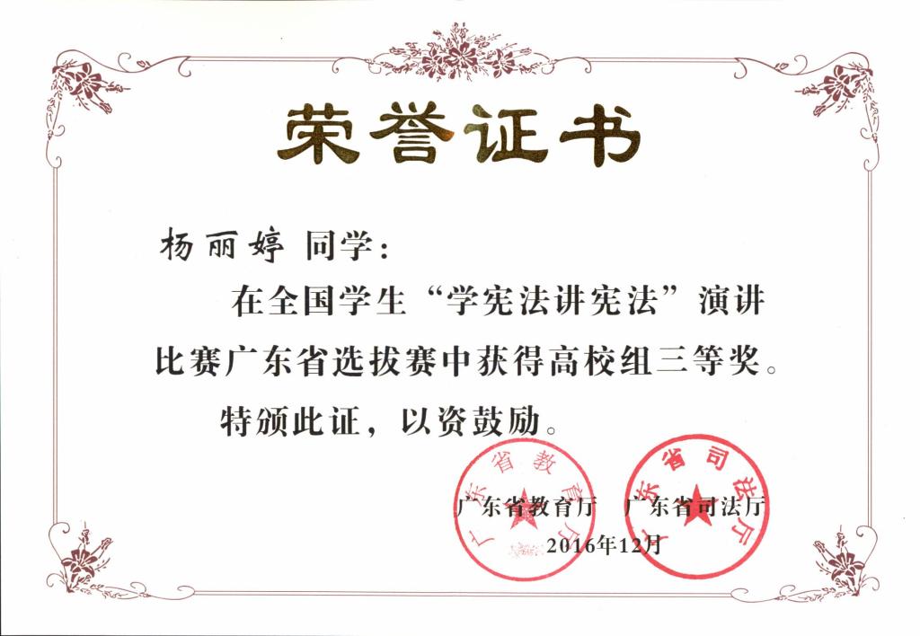 日前,从广东省教育厅主办,广东省司法厅承办的全国学生“学宪法讲宪法”演讲比赛广东省选拔赛获奖名单获悉,永利官网学生杨丽婷获高校组三等奖。