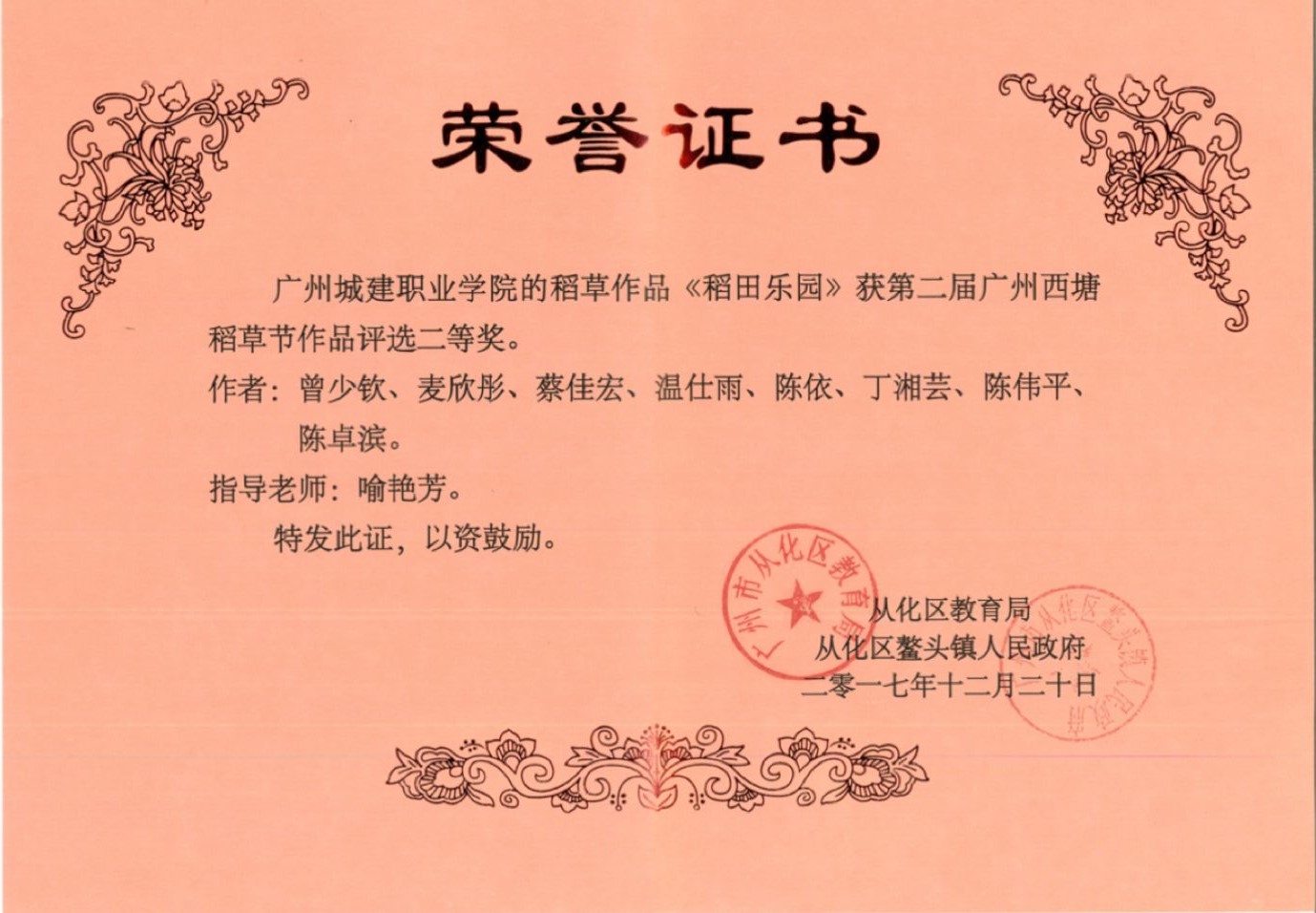 3月6日,第二届广州西塘稻草节颁奖仪式于广州市从化区鳌头镇西塘童话小镇举行。此次活动秉承结合鳌头镇西塘童话小镇建设,挖掘整合生态教育资源,为广大师生及市民提供更丰富的学习、思维和实践空间。从化9所高校、各中小学及各村委参加,永利官网学生团队在艺术与设计学院喻艳芳老师的指导下,精心准备、从容应对,一举荣获二等奖,在从化高校中排名第一。