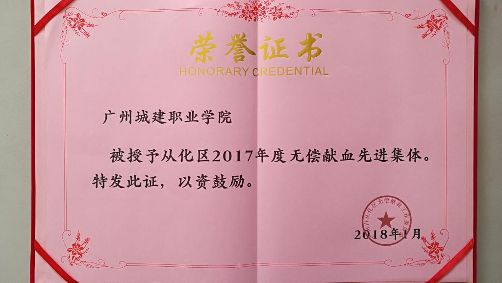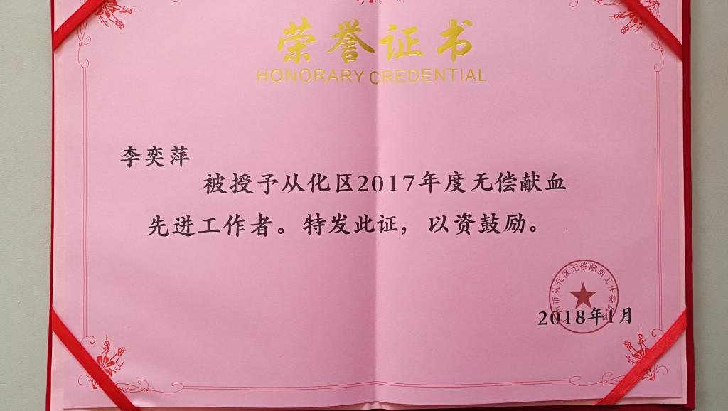 1月15日,2017年度从化区无偿献血工作总结会议在从化区卫计局召开,永利官网荣获从化区2017年度无偿献血先进集体,团委书记李奕萍获从化区2017年度无偿献血先进工作者。