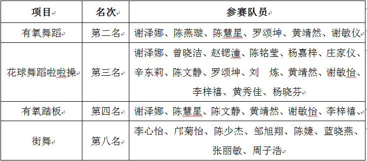 2019年5月23-29日,由广东省教育厅、广东省体育局主办的 “2019年广东省第十届大学生运动会健美操比赛”在华南理工大学(五山校区)海丽体育中心隆重举行。此次比赛共有68所大学参赛(共计1532人),高职院校组(丙组)27所(共计575人)。永利官网健美操队派出了26名运动员,参加了四个项目的比赛。经过激烈角逐,永利官网参加的所有项目顺利进入决赛,并获得了自选有氧舞蹈第二名、自选花球舞蹈啦啦操第三名、自选有氧踏板第四名、自选街舞第八名、团体总分第三名的好成绩。