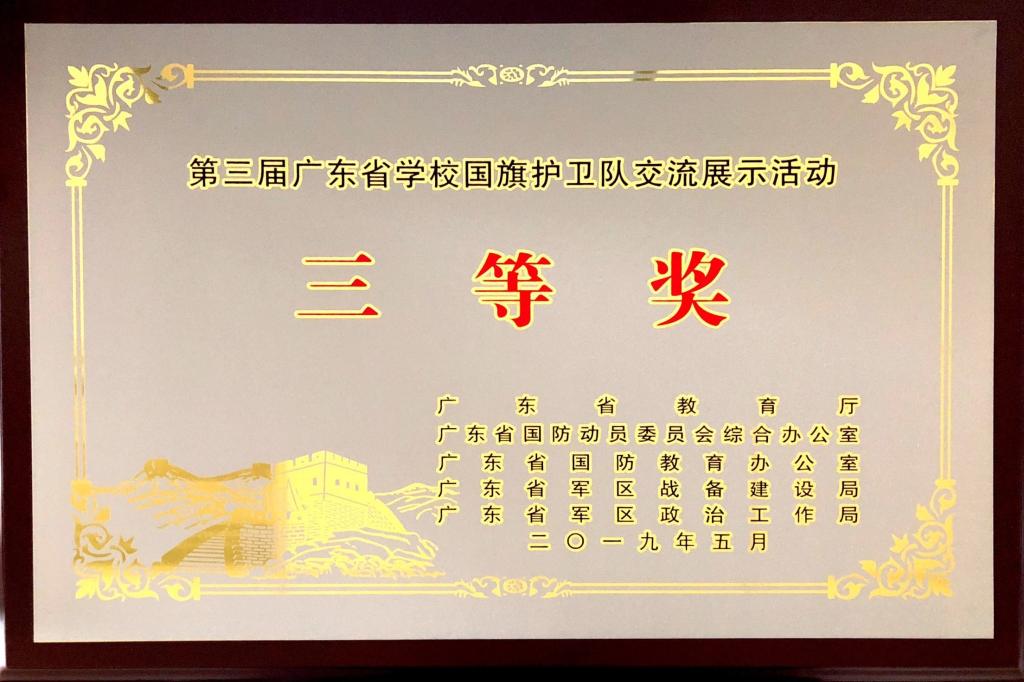5月8日,由广东省教育厅、广东省国防动员委员会综合办公室、广东省国防教育办公室、广东省军区战备建设局、广东省军区政治工作局主办的首届广东省学校国防教育成果交流展示活动在广州科技贸易职业学院举行。永利官网国旗护卫队在108所参赛高校中脱颖而出,荣获三等奖。