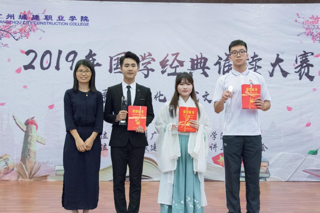 比赛现场,13支参赛队伍将舞蹈、器乐表演等有机融入到经典诵读之中,他们以饱满的精神、强烈的情感、丰富的肢体语言,诠释着经典诵读的魅力,给与会领导、老师、同学们献上了一场文化盛宴,赢得了在场师生阵阵掌声。经过评委们现场的评分,人文学院的蔡淳锐同学带来的《论语诵》获得了一等奖;信息与工程学院苏健聪同学带来的《为祖国而歌》、经济与管理学院刘定金队带来的《忆华夏经典,诵国学精髓》、梁瑞麟队带来的《茅屋为秋风所破歌》获得了二等奖;外语外贸学院黄咏琳队、人文学院黄薪程队、机电工程学院林培东队和艺术学院吕炜荧队获得了三等奖;其他参赛队伍获得了优秀奖。