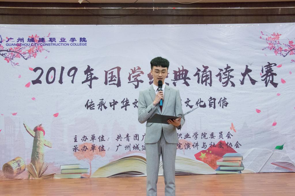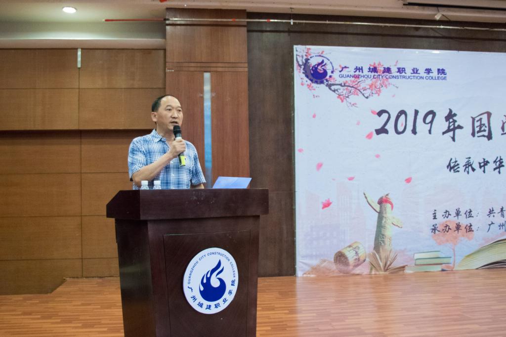 为传承中华优秀传统文化,加强校园文化建设,丰富校园生活,6月24日晚,由共青团广州城建职业学院委员会主办、演讲与社交协会承办的“传承中华文化,坚定文化自信”2019国学经典诵读大赛决赛在人文艺术楼报告厅隆重举行。学校党委书记、副校长杨清国,党委副书记、副校长张德宜,党委副书记、人文学院院长鲁岩,学生处处长孔练光,团委书记刘杰,从化区作协主席刘向阳,人文学院中文教研室主任富伟,概论教研室主任戚洪娜以及尚东玲老师,各二级学院学工副院长,部分教师代表、指导老师以及13支代表队伍的队员出席了本次大赛。