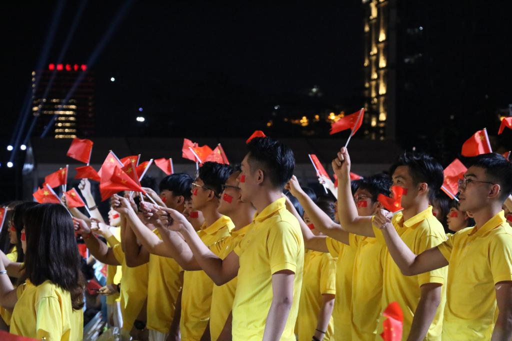 晚会最后,全体观众和演职人员同唱《我和我的祖国》,珠江新城CBD高大的建筑群灯光展现出红色的“祝福祖国”,整个晚会在观众们歌唱祖国、祝福祖国的歌声、欢呼声和掌声中落下了帷幕。
