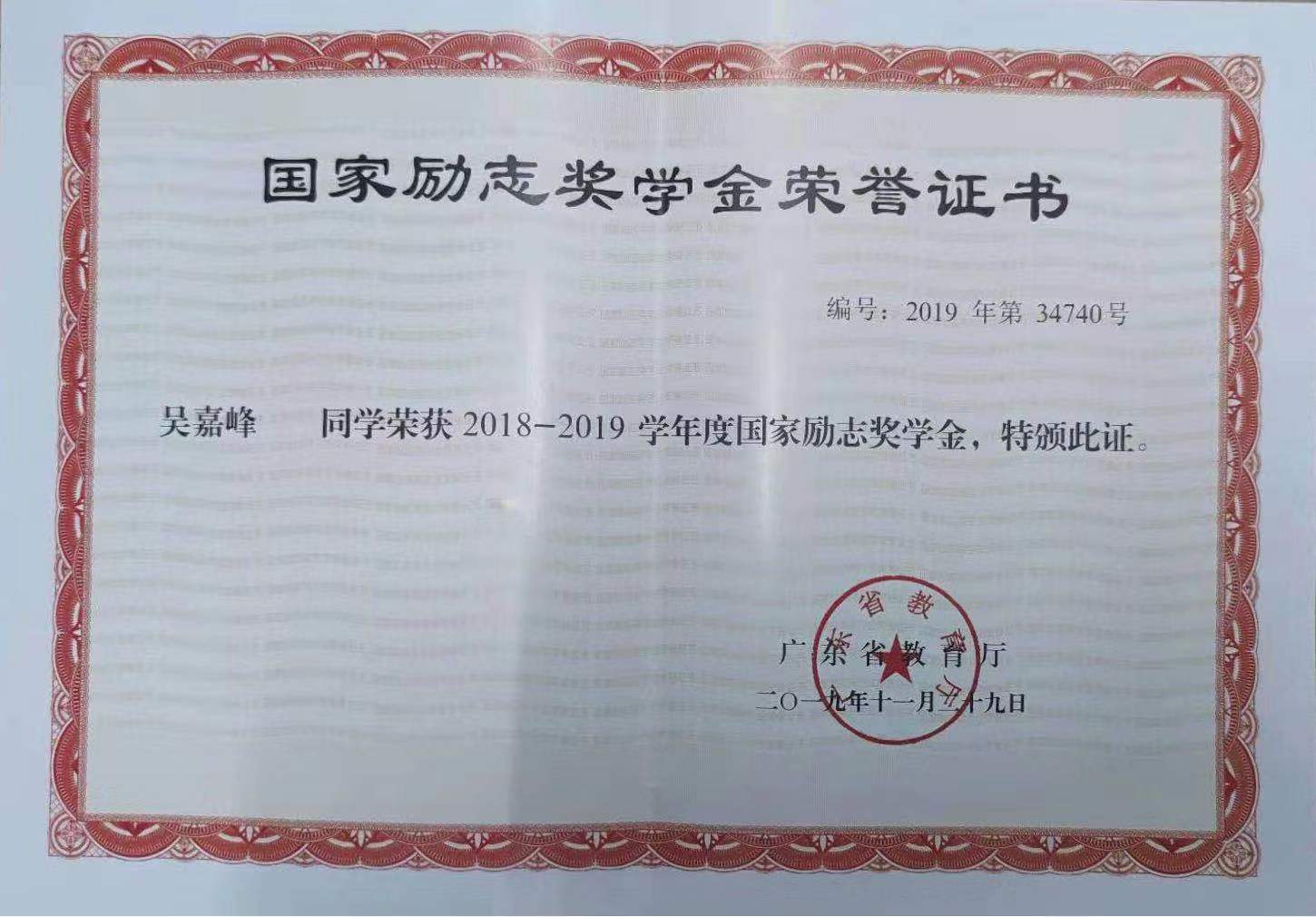 吴嘉峰,机电工程学院新能源汽车专业的学生,中共预备党员,曾任校学生会新媒体中心副主任、班级团支书等职务。他严格遵守学校各项规章制度,政治立场坚定,努力学习,奋发向上,先后荣获国家励志奖学金、广东省第二届高校防范非法集资海报和微视频大赛优秀奖、从化区优秀共青团员、学校一等奖学金和优秀学生干部等奖项20余项。