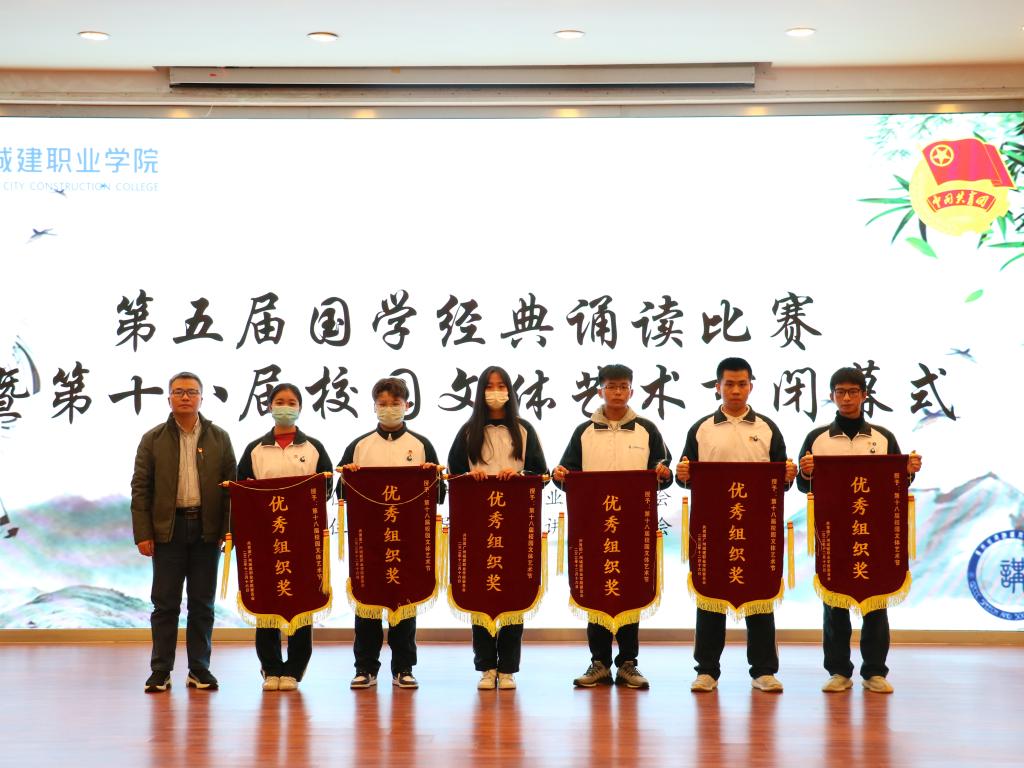 与会领导、老师为第五届国学经典诵读比赛获奖团队、选手及第十八届校园文体艺术节先进集体和先进个人颁奖。