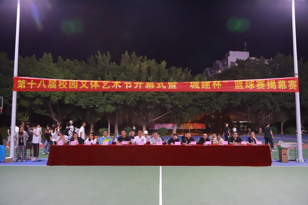 为了丰富学生的课余生活,提高综合素质,增强团队精神和集体凝聚力,学校于11月9日晚在三区篮球场举行第十八届校园文体艺术节开幕式暨“城建杯”篮球比赛。学校党委副书记、副校长张德宜,体育健康学院院长李建军,学校武装部部长、学生处处长孔练光,体育健康学院副院长兼本次比赛总裁判长江新华,各二级学院副院长及团委书记出席了本次开幕式,共有八个参赛学院代表团以及一个裁判代表团参加了本届“城建杯”篮球比赛。