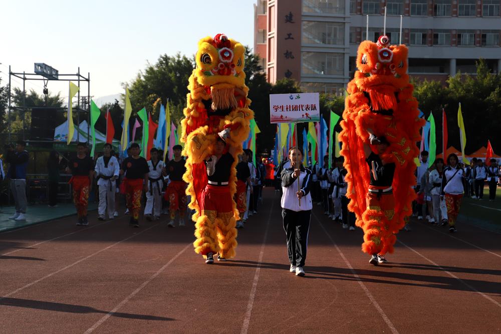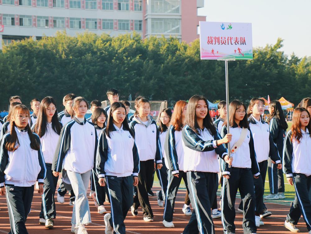 开幕式在激昂的《运动员进行曲》中拉开序幕,各方阵依次入场。首先入场的是国旗护卫队,队员们踏着整齐有力的步伐,以饱满的精神、整齐的军姿,成为运动场上一道亮丽的风景线。紧跟国旗护卫队的是各具特色的学院代表方阵和学生社团代表方阵。灿烂的笑容洋溢在所有师生的脸上,他们喊着激昂的口号,展示着意气风发、斗志昂扬的精神风貌。