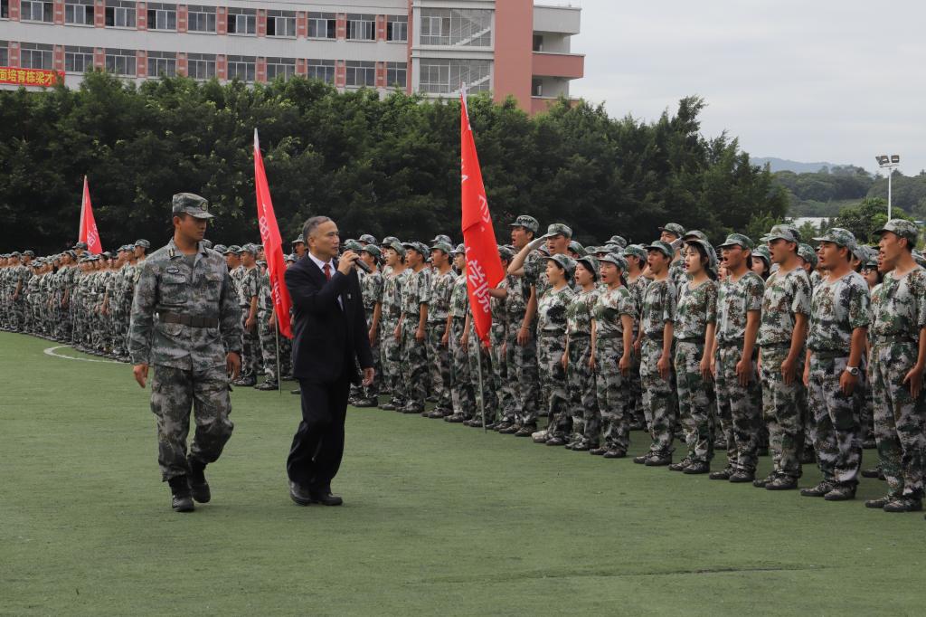 在军训团团长黄伟州的陪同下,蒋新华对严阵以待的军训队伍进行检阅,领导亲切的问候与同学们铿锵有力的回应响彻校园。