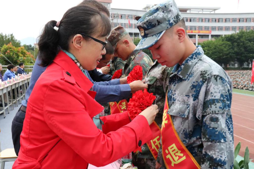 会上,学校领导、老师为2020级退役士兵代表佩戴了“退伍光荣”的大红花。