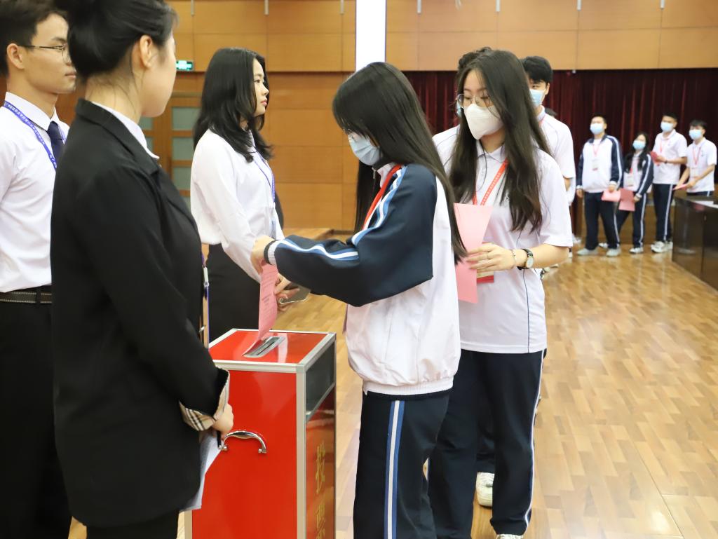 随后,学生会主席团成员候选人和常设机构成员候选人依次上台进行竞选演讲。现场191名学生代表秉着公平、公正、公开的原则进行无记名投票选举,最终张天宇、苏汝钶、黄曼茜等3名同学当选第六届学生会主席团成员,区文俊、庄丽敏、陈荣梓、苏思颖、林楚悦、黄芷晴、谢家滨、詹晓君、颜昊宇等9名同学当选第六届学生会常设机构成员。
