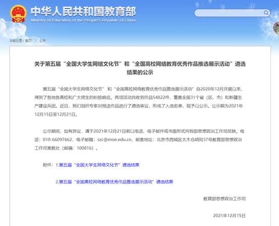 近日,教育部网站公示了第五届“全国大学生网络文化节”遴选结果,其中,“全国大学生网络文化节”名单共入选47项广东省高校作品,永利官网赖舜坤同学的作品《传播青春正能量,争做校园好网民》荣获其他类作品优秀奖。