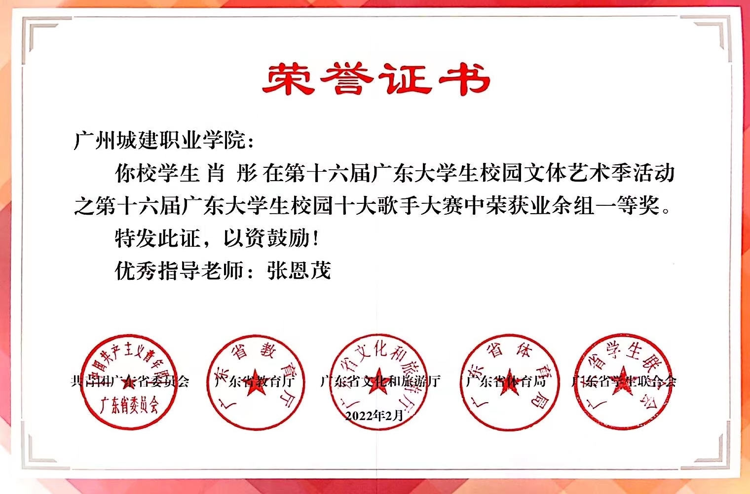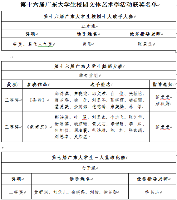 近日,由团省委、省教育厅、省文化和旅游厅、省体育局、省学联联合主办的第十六届广东大学生校园文体艺术季获奖名单公布,永利官网学子共斩获5个省级奖项,其中一等奖1项、二等奖1项、三等奖2项、单项奖1项。