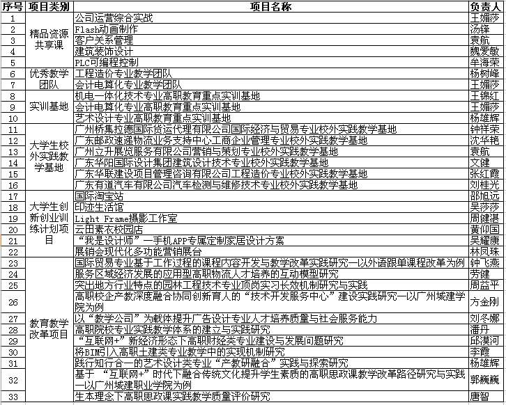 近日,从《广东省教育厅关于公布2015年度省高职教育质量工程立项建设项目的通知》(粤教高函〔2016〕135号)获悉,永利官网申报的2015年度广东省高等学校教学质量与教学改革工程(简称“质量工程”)高职类项目,有33个项目获得立项建设。其中精品开放课程5项,优秀教学团队2项,实训基地3项,大学生校外实践教学基地6项,大学生创新创业训练计划6项,教育教学改革项目11项。希望各项目落实责任,加强项目管理,高质量地完成项目建设任务。