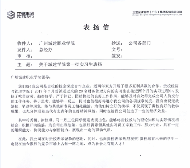 近日,正誉企业管理(广东)集团股份有限公司专门给学校寄来表扬信,表彰经管学院财务管理20名实习生两个月顶岗实习期间突出的敬业精神和出色表现。